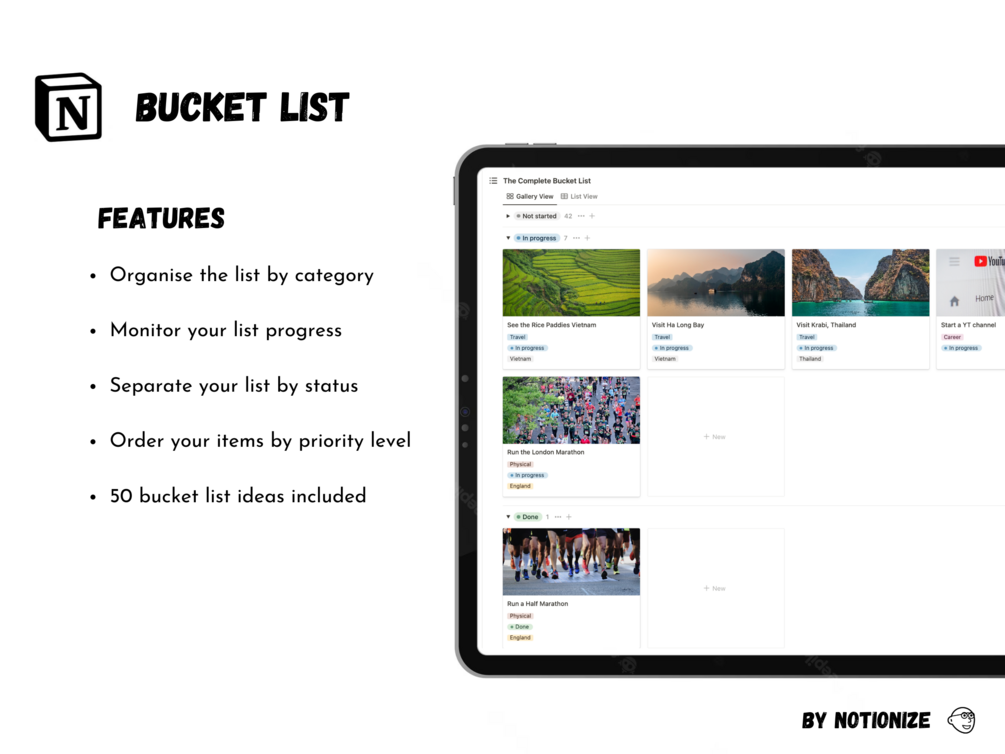 Plan your dream experiences, goals and trips all in one place with the Notionize Bucket List. With 50 ideas already provided, we've set you up to begin planning the things that you've always dreamt of.